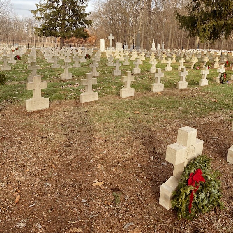 On a recent trip to visit family in South Bend, Indiana, my partner and I decided to take a walk on the grounds of the University of Notre Dame. It’s a lovely campus, with beautiful old buildings, woods full of old gnarly oaks and sycamores, and two large lakes with scenic walkways. Off the beaten path, we came across a small cemetery named Holy Cross Cemetery, the final resting place of the brothers and priests of the Congregation of Holy Cross, which founded the university in 1842. The graves date from the present era back to that time.